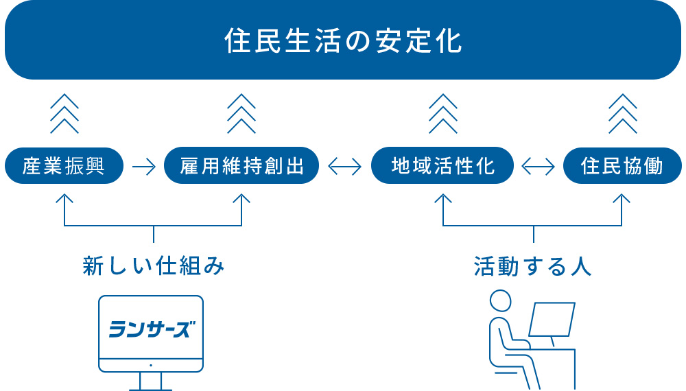 時間と場所にとらわれず働くことができる「オンラインで働く」という「新しい仕組み」を「地域の企業」が活用すれば、イノベーションや人材不足解決といった産業振興につながります。また「地域の人」が活用することができれば、地域に居ながらにして仕事をすることが可能です。