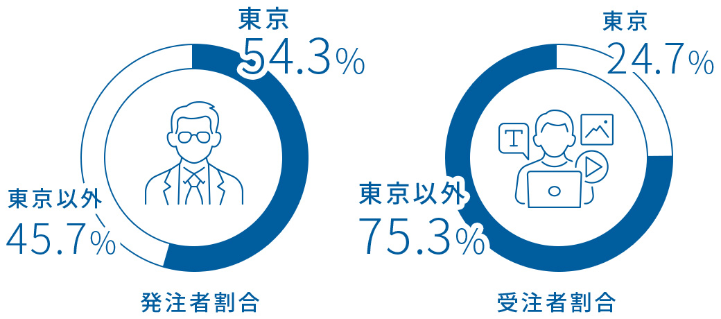 お仕事マッチングプラットフォーム「ランサーズ」がなぜ、地方創生に活用できるのか。右の図はお仕事マッチングプラットフォームの発注企業と受注者の割合を表しています。東京の企業が5割以上仕事を発注し、受注者は7割以上が東京以外の地域在住者という事実。東京に一極集中する人口に反し仕事は地方に再分配されているのです。「ランサーズ 地方創生の取り組み」は、この現象を地方創生の兆しと捉え、さらなる加速を推進します。